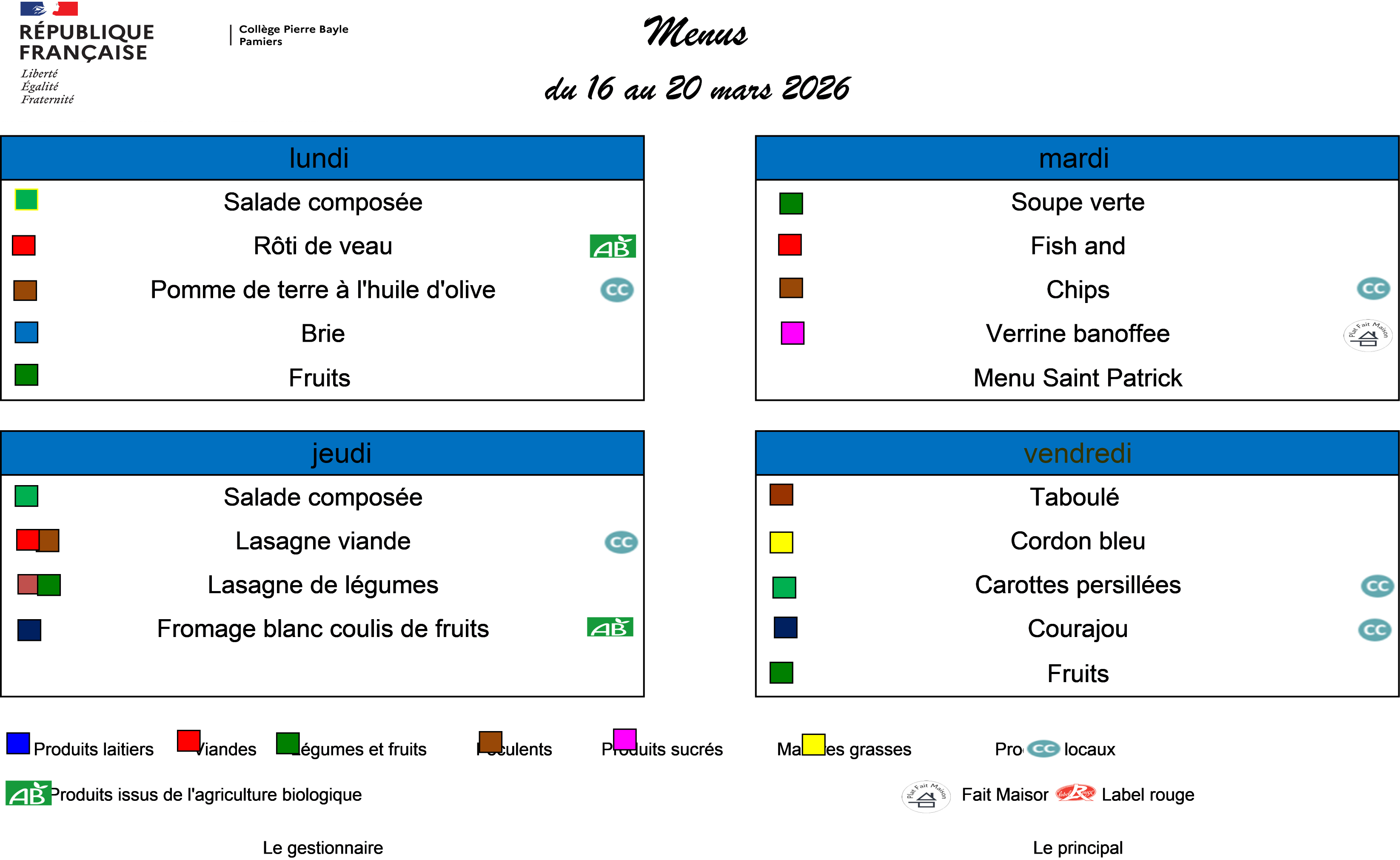 Consultez le menu de la semaine et informez-vous sur le règlement et les allergènes.
